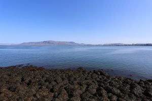A great spot for morning coffee, looking south from the Settlement Centre at Borgarnes. The back wall of the gift shop is made from some of the oldest rock in Iceland, around 13 million years old. After treating myself to a geological map of Iceland, we got into conversation and received recommendations to stop at a waterfall, cinder cones and lava tubes on our road ahead.
