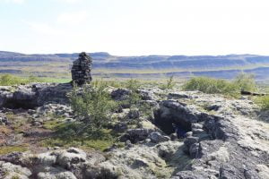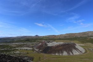 Having thought we just had 500 km of road planned today, we enjoyed the Glanni (meaning “shining”) waterfall on the Norðurá River, near the small hamlet of Bifröst and the Grabrokarhraun lava field. This extensive lava field, formed 3000-4000 years ago, is likely a result of the two cinder cones below.